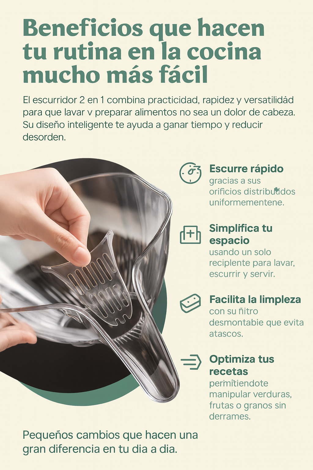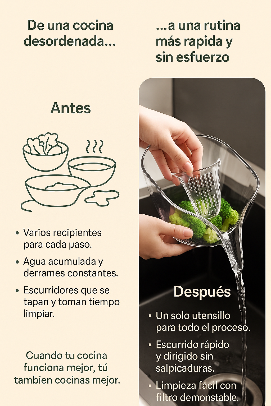 El recipiente 2 en 1 que miles de cocineros están usando para lavar, escurrir y preparar alimentos sin complicaciones.